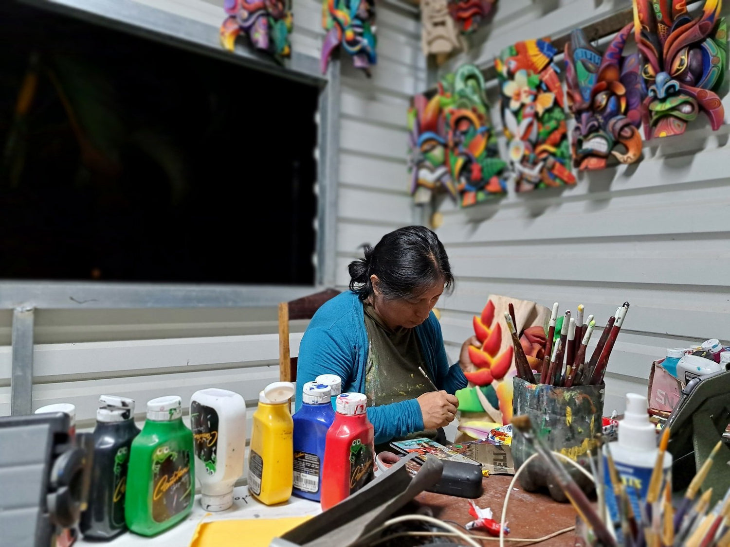 Una vez finalizado el tallado, cada máscara Boruca es pintada completamente a mano con acrílicos, mediante un proceso cuidadoso y detallado. La aplicación del color se realiza pincelada por pincelada, trabajando capas, contrastes, luces y sombras que permiten resaltar los rasgos, las expresiones y los elementos simbólicos de cada diseño.