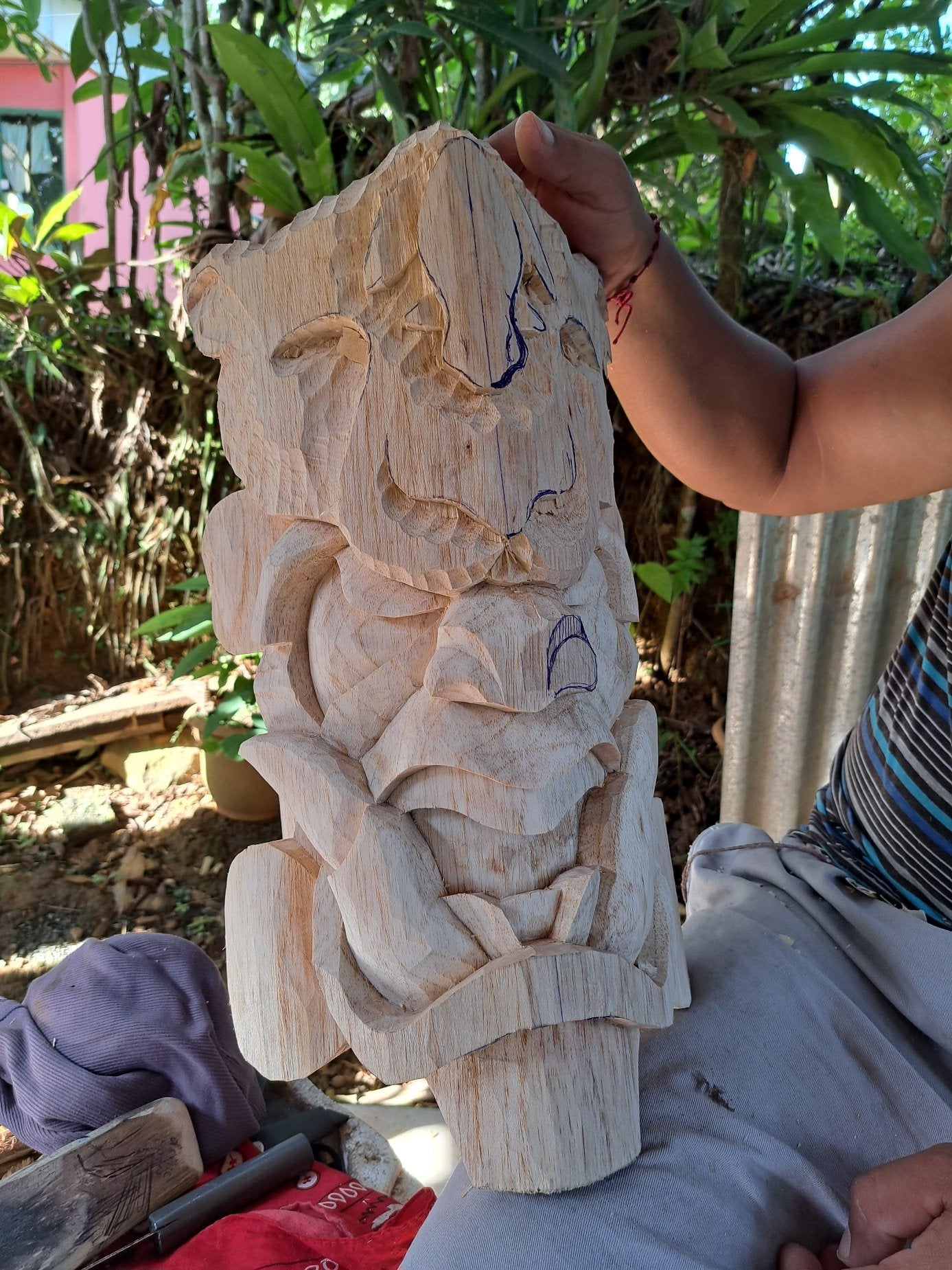 Cada máscara Boruca inicia a partir de un dibujo original, realizado cuidadosamente sobre la madera de balsa, tomando en cuenta el diseño solicitado en cada orden. Este primer trazo define la forma, la expresión y el carácter de la pieza, y es el punto de partida de todo el proceso artesanal.